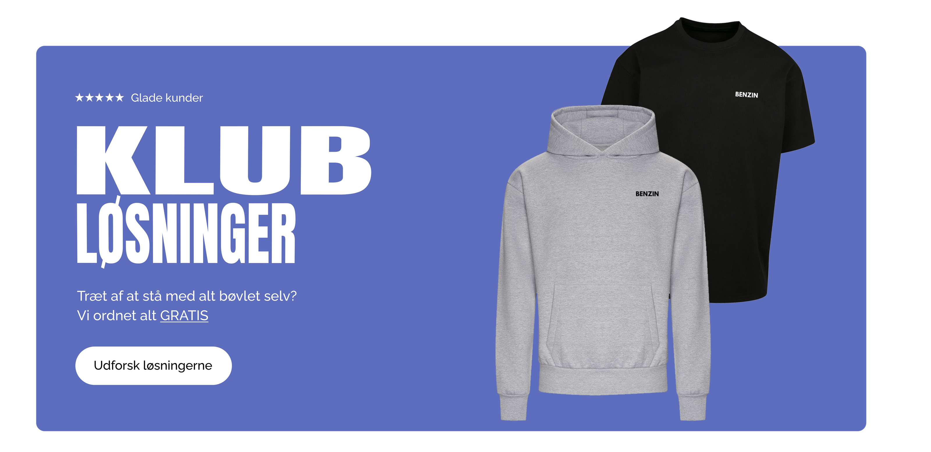Dette er noget vi hos BENZIN fjerner 100% fra jeres skulder. Vi tilbyder en pakke løsning der er helt gratis, ingen binding. Vi står for lager og logistik på jeres tøj. I kan have ligeså mange desings og farver i har lyst til - det er kun jeres fantasi der sætter grænser. I får opsat et link, hvori i vil kunne se alle jeres produkter.